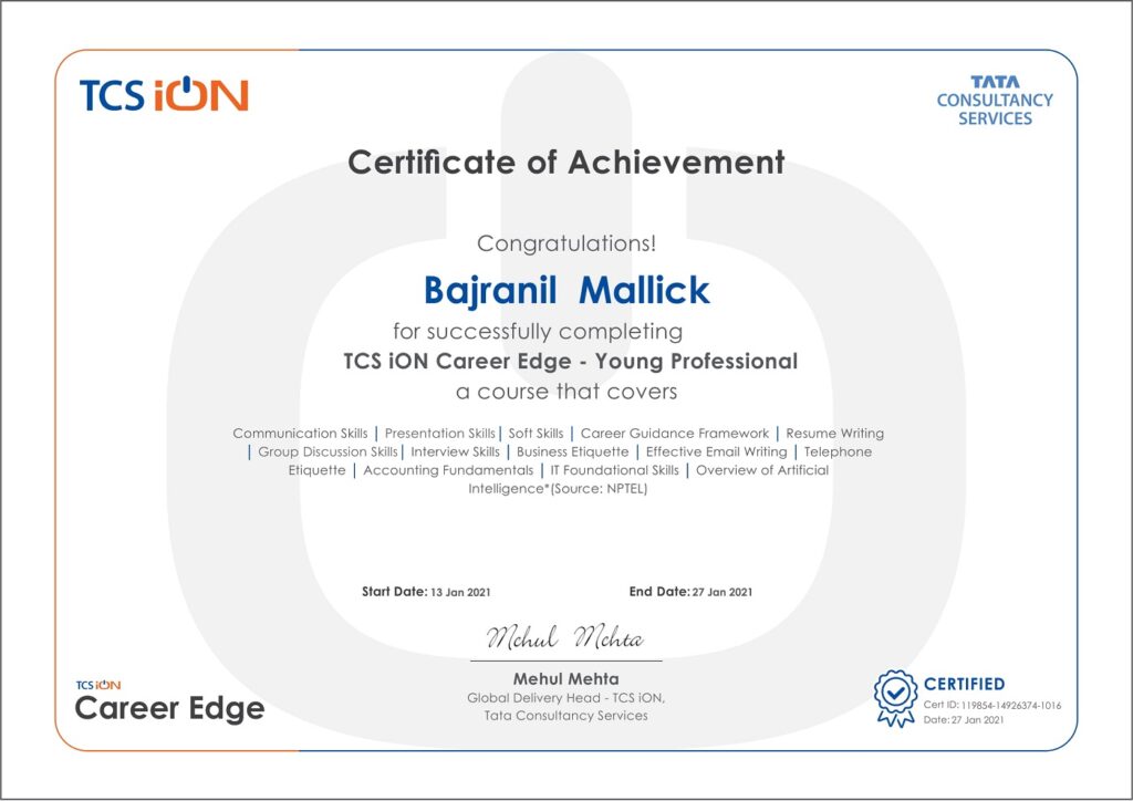 | Career Edge Program – TCS iON (Communication Skills, AI) | Tata Consultancy Services (2021) |